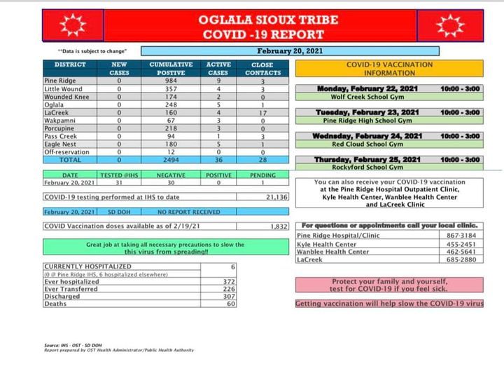 Babette Thin Elk hat auf Facebook den Covid-19 Report des Oglala Sioux Tribe gepostet. Und es sind freudige Nachrichten. Am 20. Februar 2021 gab es in den verschiedenen Distrikten keine neuen Fälle. Das müssen wir natürlich auch mit euch teilen!